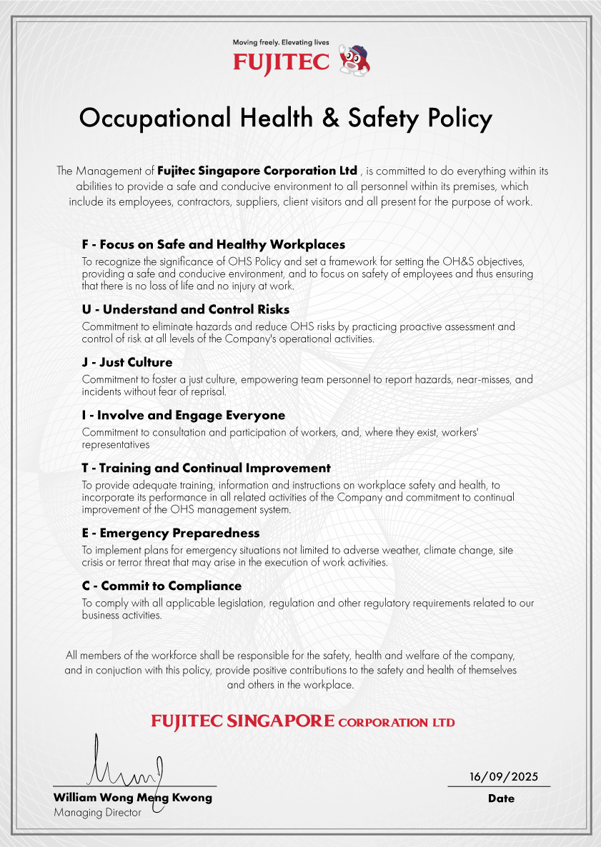 The company is well connected globally through sharing of the latest design, engineering, product technologies, and use of digital technology, mobile apps and people resources. With holistic strategic planning, Fujitec Singapore will move forward, upholding the Mission and Vision strongly, contributing to the economic growth of Singapore as well as in countries where Fujitec has its business presence.